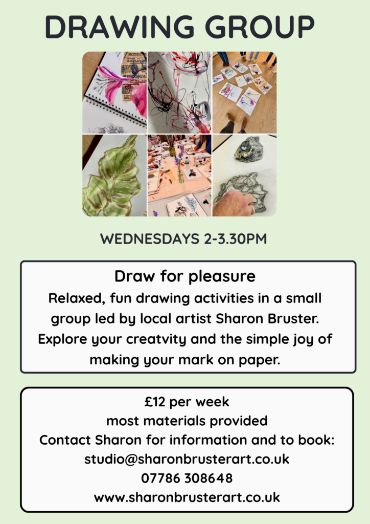 - Drawing group with local artist Sharon Bruster is every Wednesday from 2-3.30pm – please book with Sharon in advance. We book in blocks of 6 sessions. Now taking bookings for April 22nd onwards